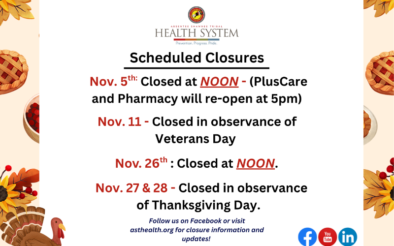 The accompanying image is the current operating hours of the Absentee Shawnee Tribal Health System as of January 3rd, 2024.