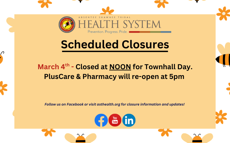 The AST Health System will be closed August 5th for AST Day. The PlusCare Clinic will be open (holiday hours) from 9:00 AM to 5:00 PM (last walk-in appointment at 4:30 PM).