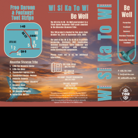 About us The Wi Si Ka To Wi - Be Well grant project is a Tribal Opioid Response (TOR) grant awarded to the Absentee Shawnee Tribe from the Substance Abuse and Mental Health Administration (SAMHSA) . The Wi Si Ka To Wi project is funded for five years - from October 1st, 2024 to September 30th, 2029. Through the Wi Si Ka To Wi, we will provide prevention, treatment, MAT (medication assisted treatment), overdose prevention and recovery services with respect, understanding and compassion . |